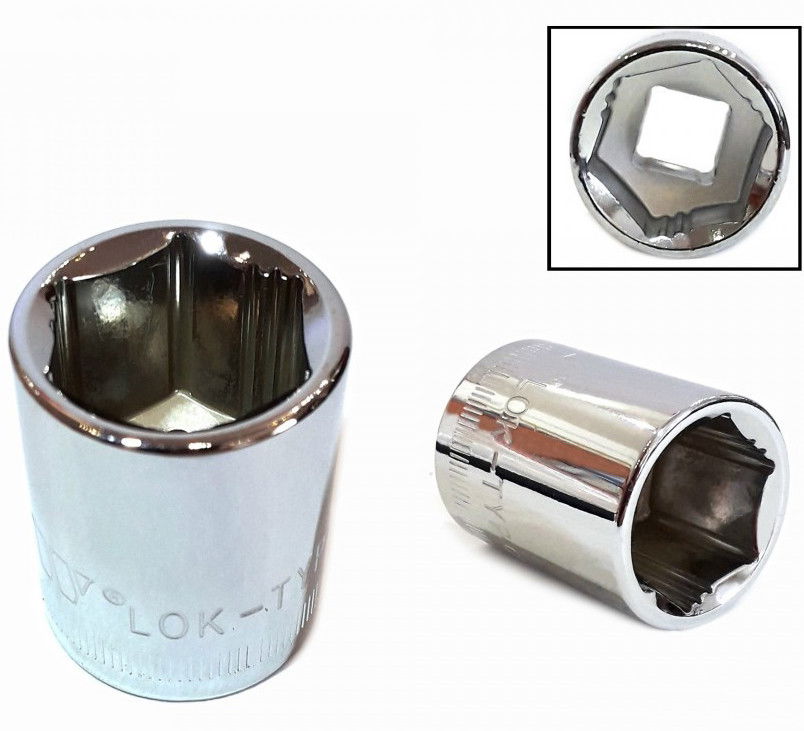 Lok-Typ dugókulcs fej, 3/8"-os, 6 lap fejű kiszerelésben, erős Chrome-Vanádium acélból készült, skót ipari minőségű.