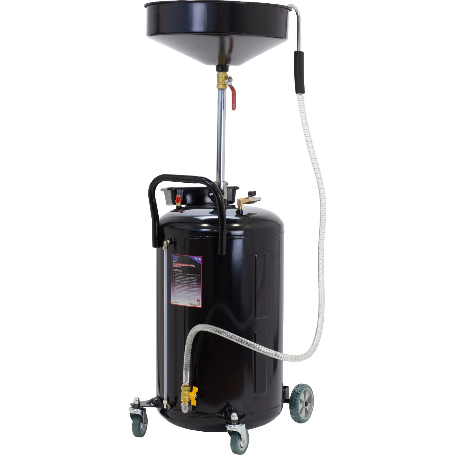 Fáradt olaj leeresztő kocsi, állítható magasságú olajleeresztő tölcsérrel, 70 literes használt olaj tároló tartállyal.